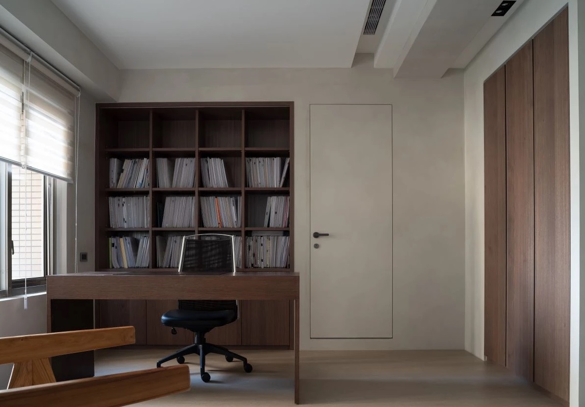 會(huì)議室以特制的玻璃書柜做為隔屏,打上洗練的光帶,讓書柜成為整個(gè)空間中最迷人的裝置藝術(shù),達(dá)到透光不透影的目的,也借此達(dá)到分享光源,化解空間陰暗的問(wèn)題。