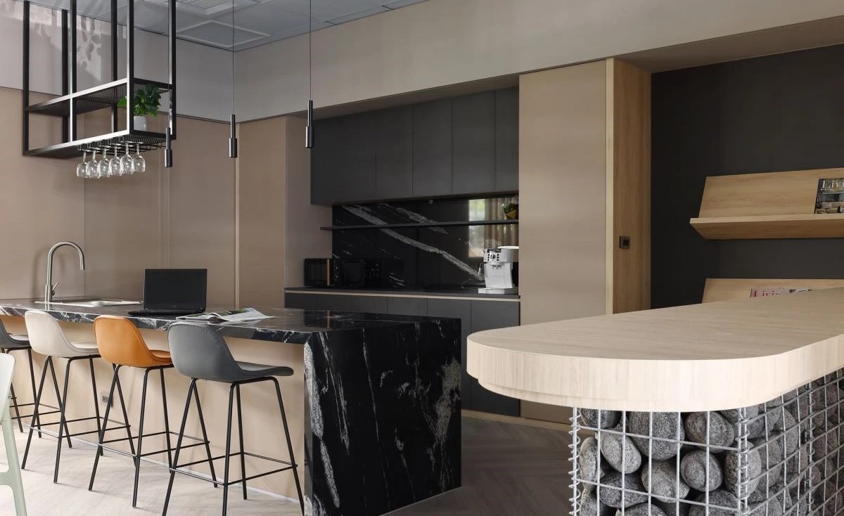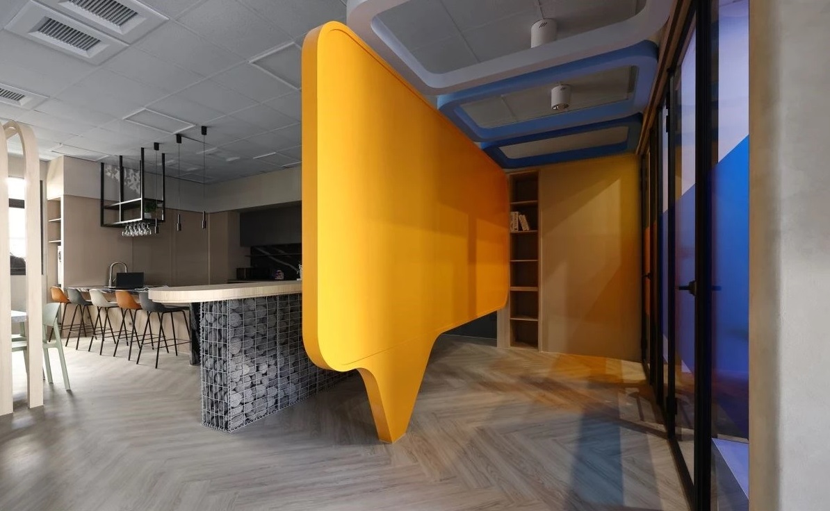 入口處坐落鮮明的亮橘對(duì)話框,給人耳目一新的朝氣活力,更強(qiáng)調(diào)人與人之間溝通的重要性,并在背面安排白板設(shè)計(jì),加上由石塊奠基而成的簡(jiǎn)報(bào)臺(tái),順勢(shì)建立起小型的會(huì)議室。輕食吧臺(tái)區(qū),注入靜謐的深黑大理石,輔以俐落的鐵件吊架、收納柜,配置流理臺(tái)及烹飪小家電,讓員工能滿足午間的料理需求,平日也是彈性寫意的辦公區(qū),隨時(shí)切換截然不同的工作心情。