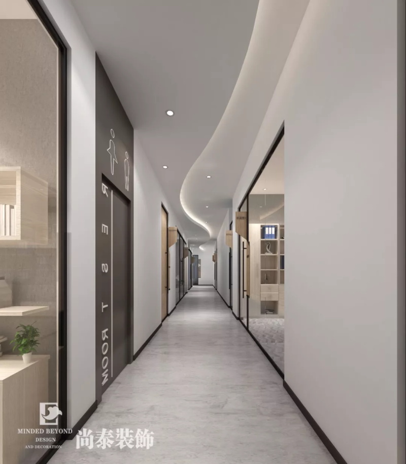 過(guò)道區(qū)域是鏈接和貫通所有區(qū)域的樞紐,吊頂沿用了圓弧的設(shè)計(jì),活潑靈動(dòng)。色調(diào)和材質(zhì)的搭配讓所有的的區(qū)域風(fēng)格和諧統(tǒng)一。大量玻璃隔斷的運(yùn)用,散發(fā)著自然、透氣的輕松氛圍。