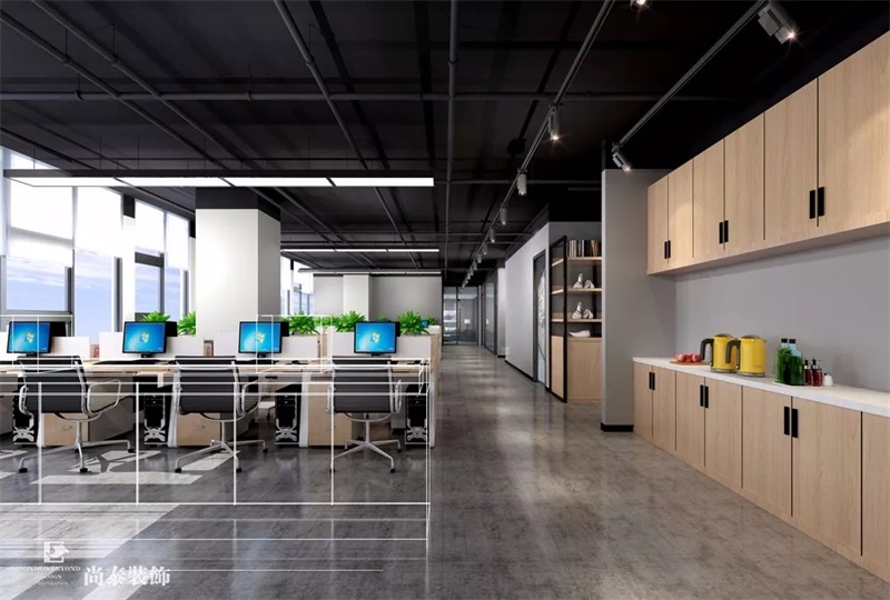 以工業(yè)風設計為理念,前臺采用簡單的白色大理石材料作為展示,背景是水泥墻加木紋鋁方通,凸顯工業(yè)風氣息。在進門接待處安排了鑲嵌頂部的鋼架結構書柜,讓設計不僅是裝飾,更具有實用性。整一個空間頂面噴黑處理, 提升整個空間的工業(yè)氣息。為此,尚泰設計師傾全力打造了一個符合該公司形象的辦公空間。