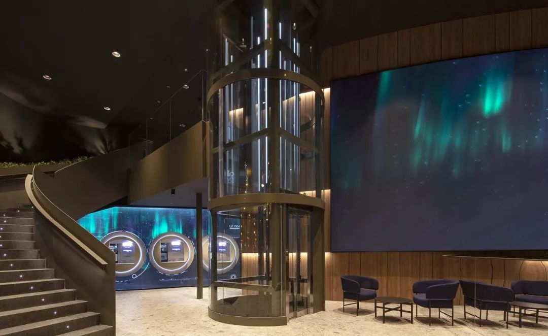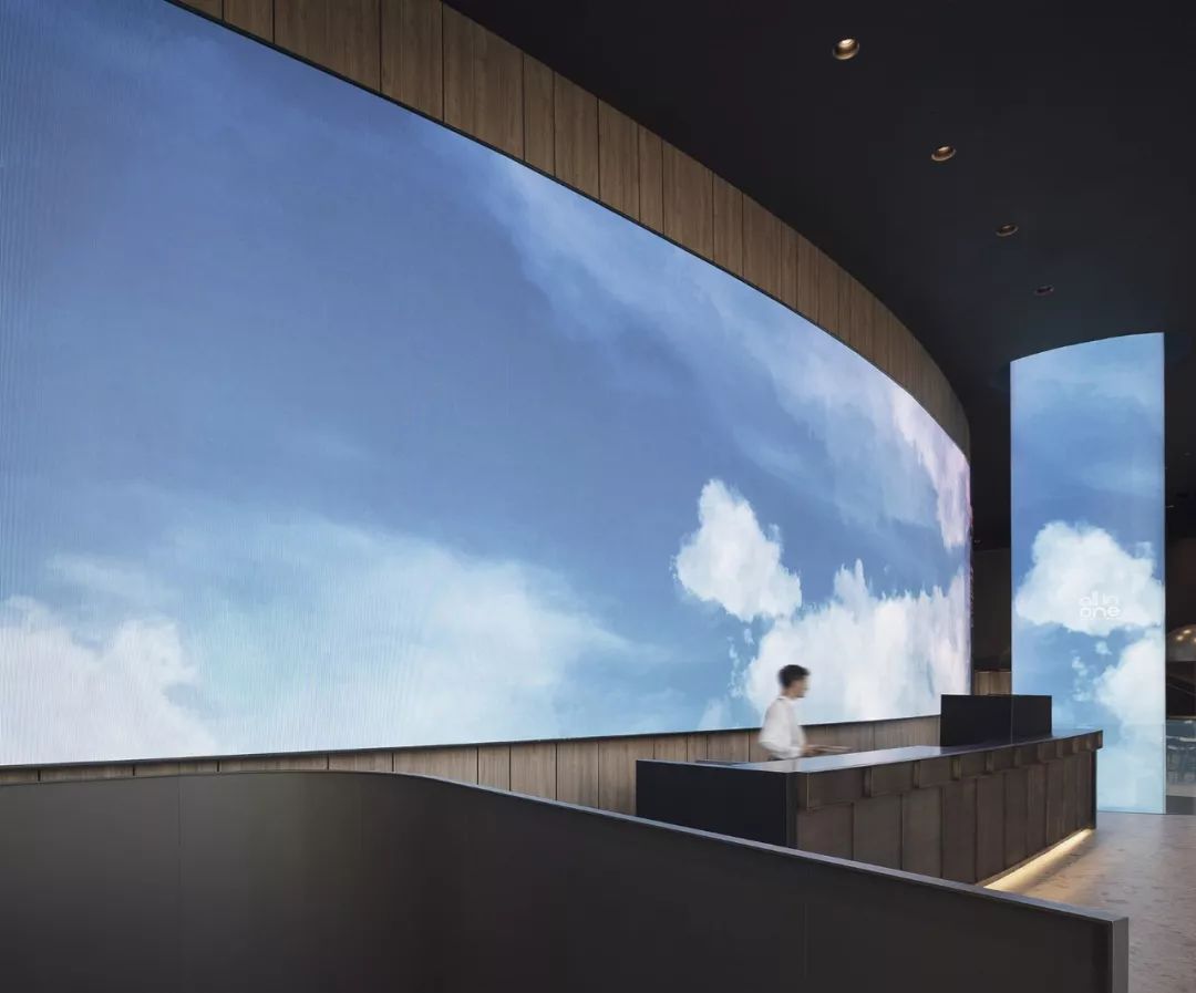 大屏LED屏幕的前臺(tái),在西班牙一家銀行辦公室的大廳里,前臺(tái)是由黃銅打造而成,顏色單一形式簡(jiǎn)潔,背后一面弧形的LED大屏,不間斷地呈現(xiàn)綠植等自然元素的影像,從而將自然景觀引入室內(nèi),給人們送來(lái)清爽的慰藉。