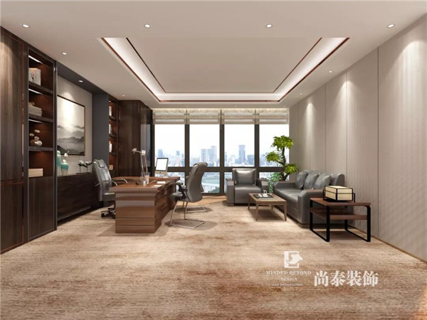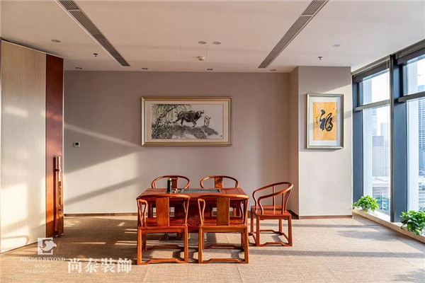 老板辦公室屬于公司決策型人才的辦公空間,設(shè)計(jì)風(fēng)格又跟開(kāi)放辦公的活潑不同,采用了較為沉穩(wěn)的中式風(fēng)格,象征著掌權(quán)者沉穩(wěn)冷靜、運(yùn)籌帷幄的性格特點(diǎn),在空間裝飾中加入了中國(guó)文化元素,給空間增添傳統(tǒng)文化哲學(xué)的底蘊(yùn)美。
