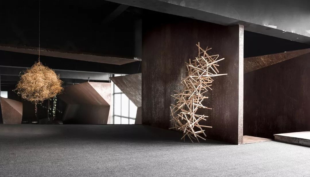 藝術(shù)裝置是這個(gè)空間里不可缺少的活力和思想的體現(xiàn),纏繞的金色鐵絲球,像思考著腦中繁雜多變的思路;根根堆疊看似毫無(wú)秩序的木條,卻奇異地平穩(wěn)搭建成一個(gè)高度的架構(gòu);行走著的人形裝置,永遠(yuǎn)朝著光的方向步履不停。